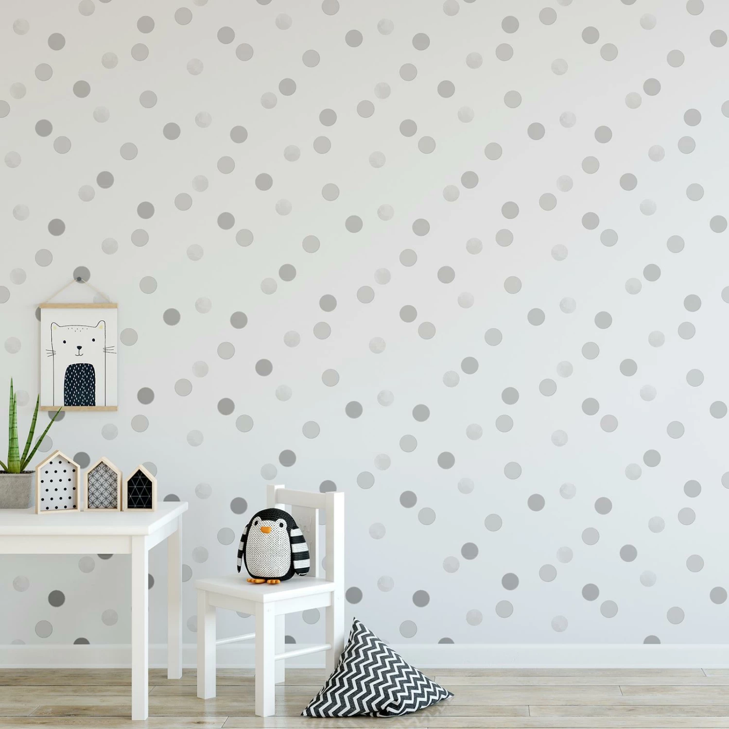 This watercolour Polka Dots wallpaper is ideal for bedrooms, nurseries and playrooms. The simple yet effective design features an all-over pattern of metallic and hand painted watercolour polka dots in soft complimentary shades on a white background. Easy to apply just paste the wall to hang.
