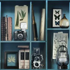 Be an explorer and add instant character to your room with this fantastic deep blue shelving wallpaper, complete with old school cameras and literature. This Wallpaper creates the effect of years and years worth of precious collectibles on realistic looking shelves, this paper truly is a conversational piece.Use as a feature wall or on multiple walls for the ultimate transformation.
