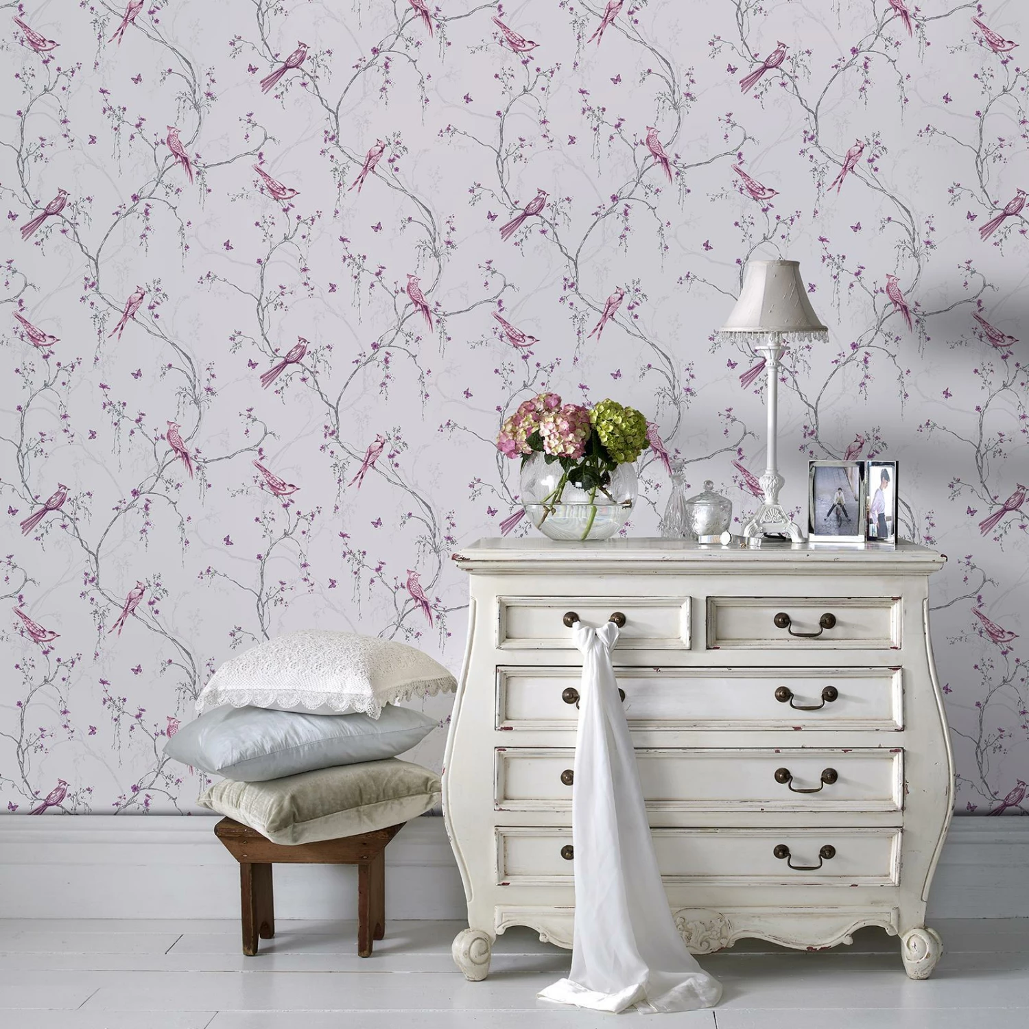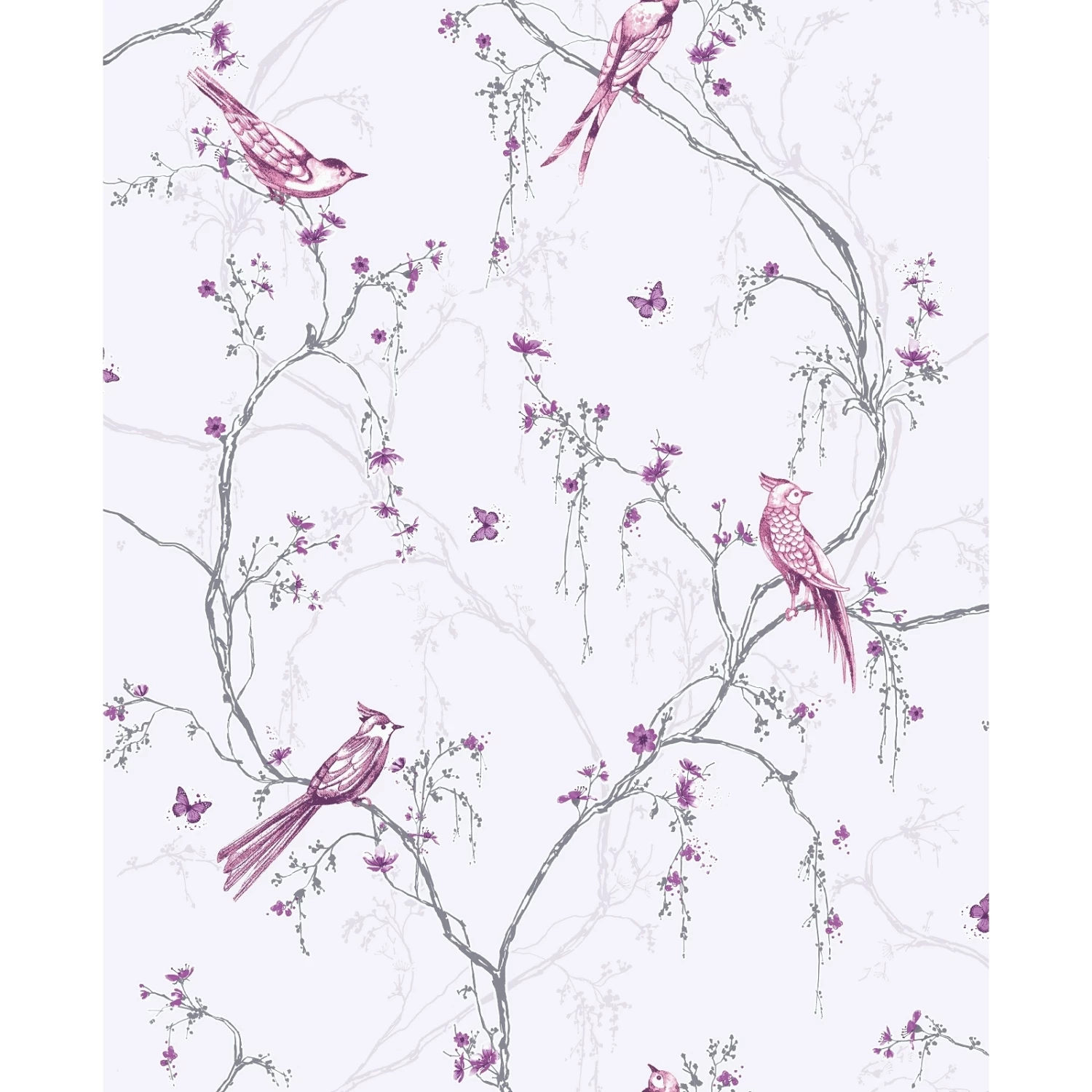 Songbird lilac wallpaper adds a delicate feminine design to an easy living colour palette. The interlacing trail of birds on fine blossom branches and dotted with butterflies is enhanced by subtle hints of glitter and mica.