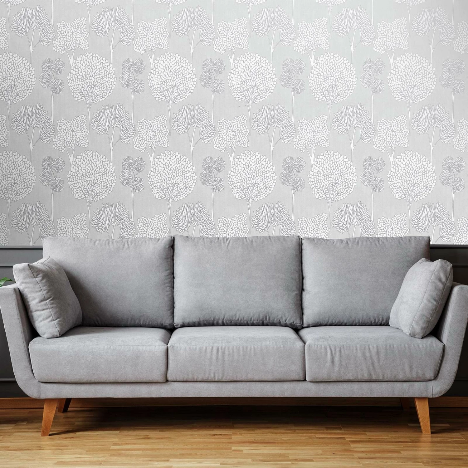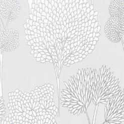 Whimsical is a stylish repeating tree print. Featuring grey tones and subtle glitter finish this wallpaper is perfect for a bedroom, living room or dining room / kitchen.
